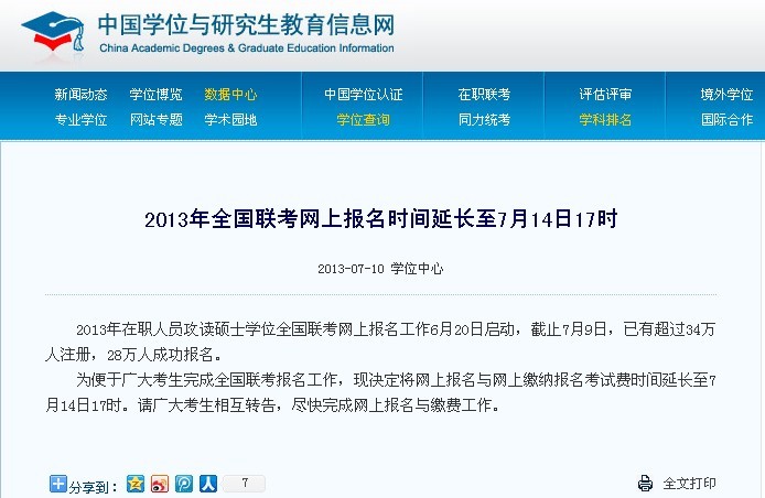 2013年在职人员攻读硕士学位全国联考网上报名工作6月20日启动,截止7月9日,已有超过34万人注册,28万人成功报名。
